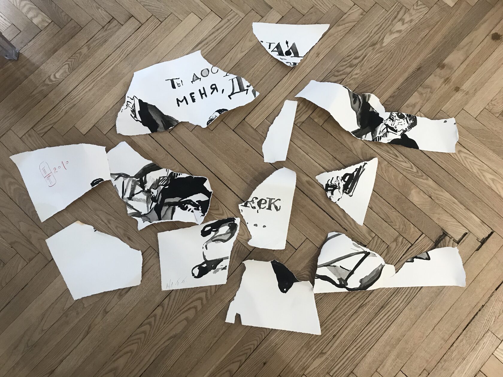 "I am sick of you, Pavel" is a torn into parts "I am sick of you, Jack" graphic artwork by Pavel Pepperstein. It was Zakhar's way of expressing his disagreement with the famous artist's social behavior. The performance was documented by Anna (video and photos accompany the installation).