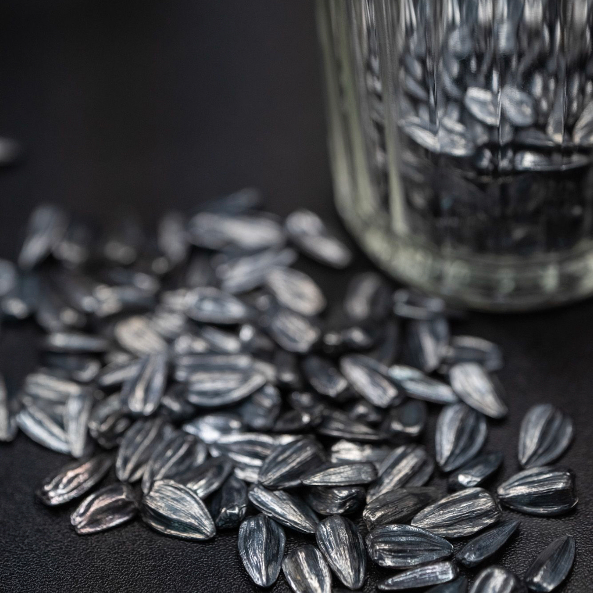 in the glass have to be touched by hand to feel the discrepancy between what the eyes see and what the hands feel: visually, with the help of handwork and silver blackening, a perfect illusion of real seeds in the glass is created, only to the touch you can feel how heavy and cold they are.