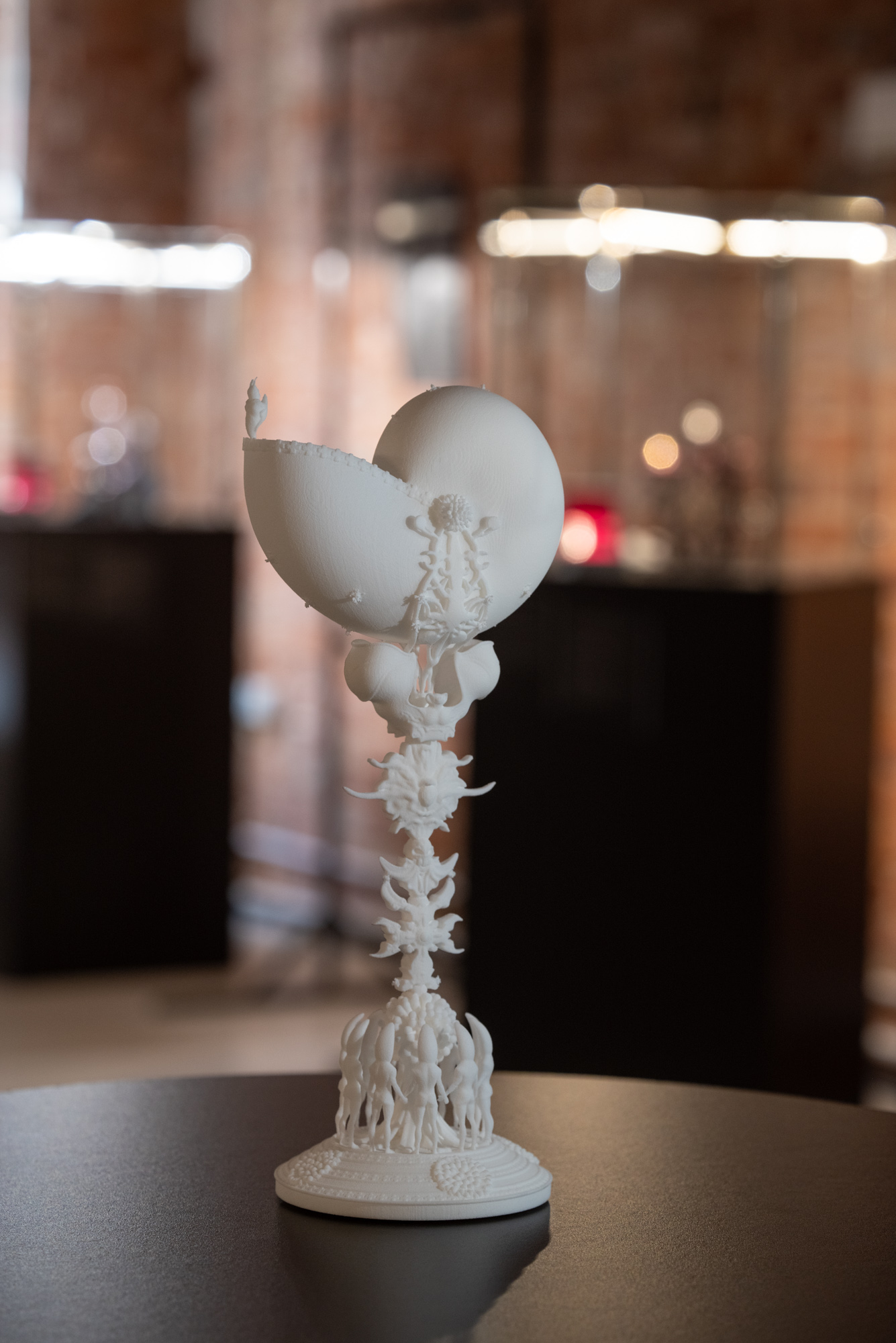 The Nautilus Goblet 2020 is a collaboration between Ilya Fedotov-Fedorov, A-Z and the Fragment gallery. A complex design combines with an expert craftsmanship – three unique cups are made by Epic Jewellery. Each is finished in a unique shade of anodized titanium and set with rare precious stones, including a 69-carat beryl. One more art object is a 3D-printed model of the object. It was produced in a limited quantity, only ten of them were made, making it a unique collector's piece
